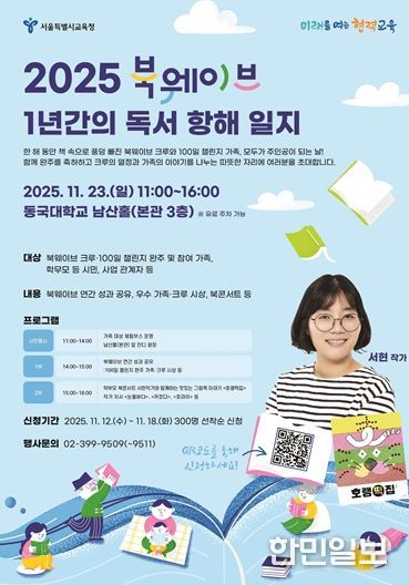 한민일보 서울포커스 국용호 기자 | 서울특별시교육청은 오는 11월 23일(일) 동국대학교 남산홀에서 가족독서 캠페인 '온 가족 북웨이브'의 1년 여정을 돌아보는'2025 북웨이브, 1년간의 독서 항해일지'를 개최한다. 이번 행사는 북웨이브 100일 챌린지 완주 가족, 북웨이브크루, 학생·시민이 함께 참여하는 서울시교육청 대표 독서문화 축제다.