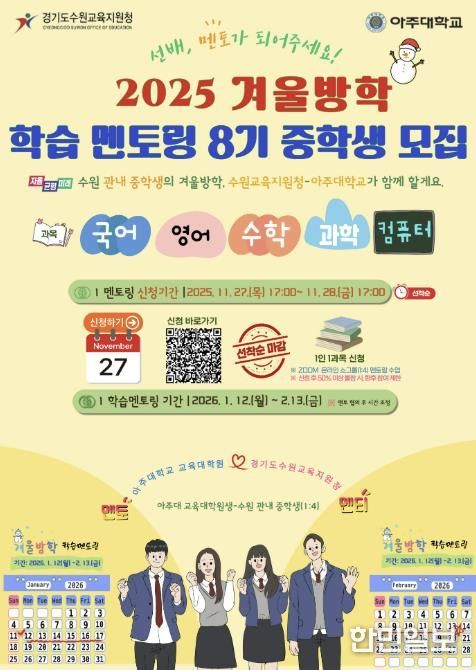 한민일보 서울포커스 진광성 기자 | 경기도수원교육지원청은 2026년 1월 12일부터 2월 13일까지 관내 중학생을 대상으로 '2025 겨울방학 학습 멘토링 8기'를 운영한다. 이번 프로그램은 ZOOM을 활용한 비대면 소그룹(1:4) 멘토링으로 진행되며, 아주대학교 교육대학원과 협력해 운영하는 교육 기부 기반 상생 프로그램이다.