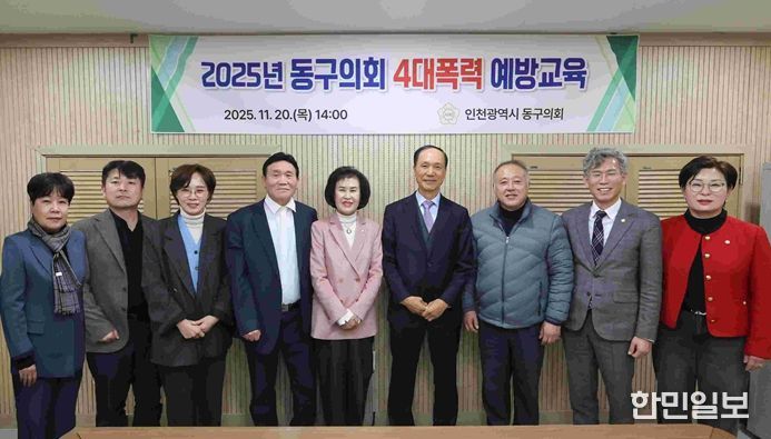 한민일보 서울포커스 백진욱 기자 | 인천 동구의회는 지난 20일 의회 세미나실에서 구의원과 의회사무과 공무원을 대상으로 ‘4대 폭력 예방교육’을 실시했다.