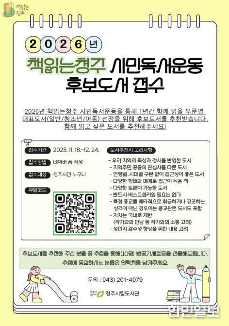 한민일보 서울포커스 김다남 기자 | 청주시립도서관은 시민 독서운동 ‘책읽는청주’의 2026년도 대표도서 선정을 위해 오는 12월 24일까지 시민 추천을 접수한다고 21일 밝혔다.