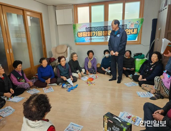 한민일보 서울포커스 김서윤 기자 | 남해읍주민자치회(회장 하희택)는 남해읍행정복지센터와 합동으로 지난 11월 14일부터 18일까지 5일간 신기, 서변, 죽산, 유림1, 유림2 경로당 등 읍 도심지 내 경로당 5개소를 순회 방문하여 어르신들을 대상으로 올바른 생활폐기물 분리배출 방법에 대한 교육을 실시했다.