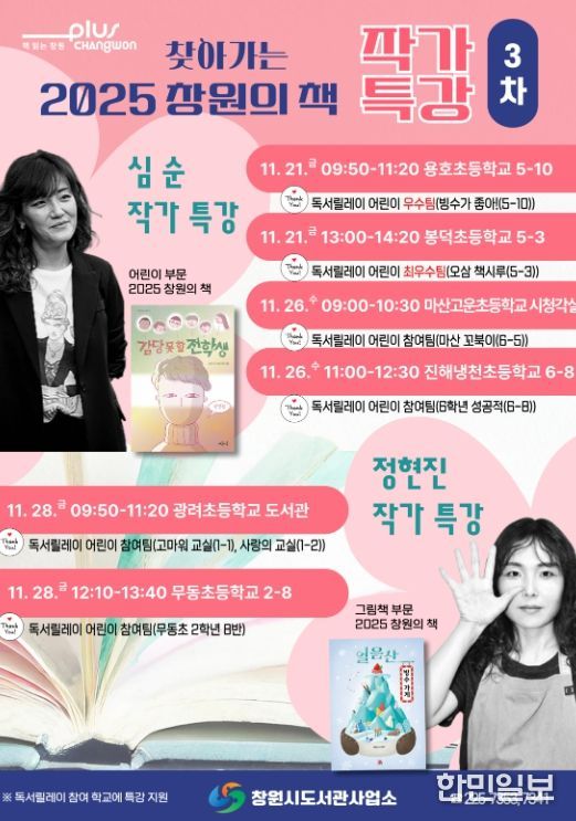 한민일보 서울포커스 김서윤 기자 | 창원특례시 도서관사업소는 11월 21일부터 28일까지 ‘찾아가는 2025 창원의 책 작가 특강’을 운영한다.