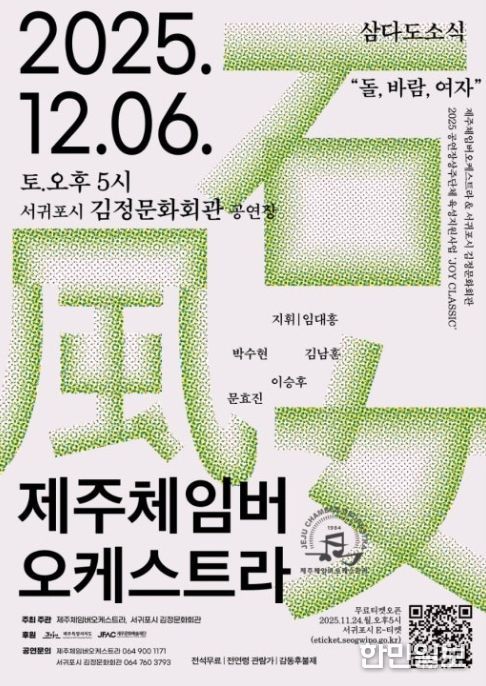 한민일보 서울포커스 김다남 기자 | 서귀포시는 2025년 공연장 상주단체 육성지원 사업의 일환으로, 제주체임버오케스트라의 '삼다도 소식'을 12월 6일 오후 5시에 김정문화회관 공연장에서 개최한다고 밝혔다.