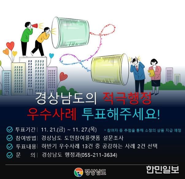 한민일보 서울포커스 박근원 기자 | 경상남도는 2025년 하반기 적극행정 우수사례 선정을 위해 오는 11월 27일까지 ‘경상남도 도민참여플랫폼’에서 온라인 도민투표를 실시한다.
