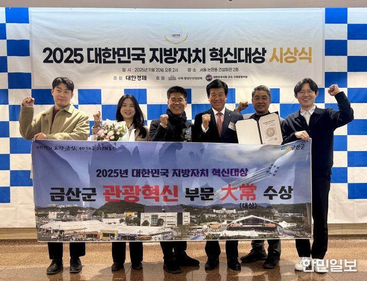 한민일보 서울포커스 유돈상 기자 | 금산군은 20일 서울시 강남구 논현동 건설회관에서 열린 2025 대한민국 지방자치 혁신대상 시상식에서 관광혁신부문 대상을 받았다.