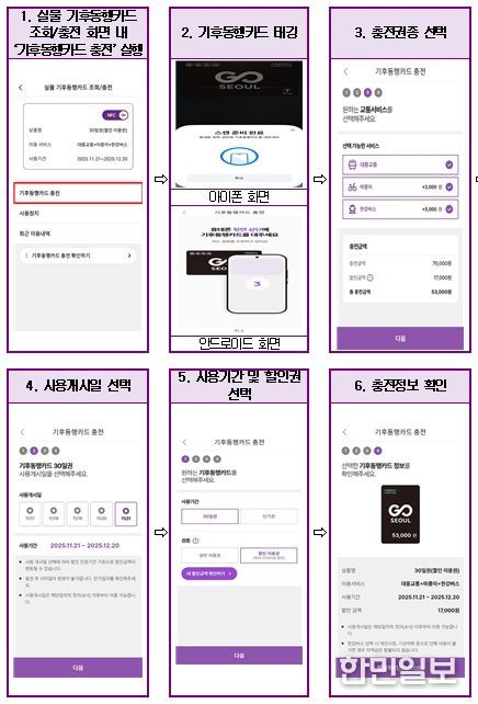 한민일보 서울포커스 국용호 기자 | 모바일 카드와는 달리 직접 지하철역을 방문해야 충전과 환불이 가능했던 ‘실물 기후동행카드’가 앞으로는 모바일앱으로도 충전할 수 있고 필요시 사용정지와 환불도 휴대폰에서 가능해진다. 안드로이드폰과 아이폰 상관없이 모두 가능하다.