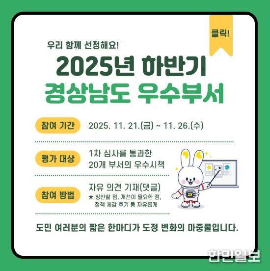 한민일보 서울포커스 박근원 기자 | 경상남도가 ‘2025년 하반기 도정업무 실적 우수부서’ 선정을 위해 오는 26일까지 도민 의견을 받는다.