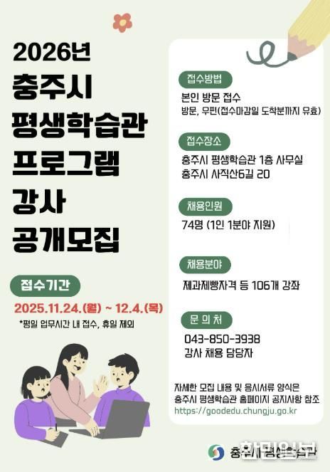 한민일보 서울포커스 김다남 기자 | 충주시 평생학습관은 2026년 한 해 동안 정규 평생학습 프로그램을 담당할 강사 74명을 공개모집한다.