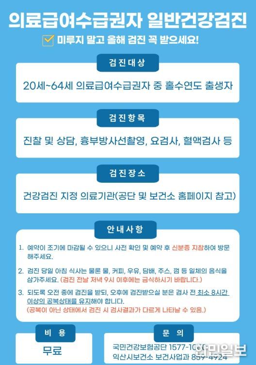 한민일보 서울포커스 김용택 기자 | 익산시는 12월 31일까지 진행되는 '의료급여수급권자 일반건강검진'과 관련해 아직 검진을 받지 못한 대상자들에게 검진을 받을 것을 당부했다.