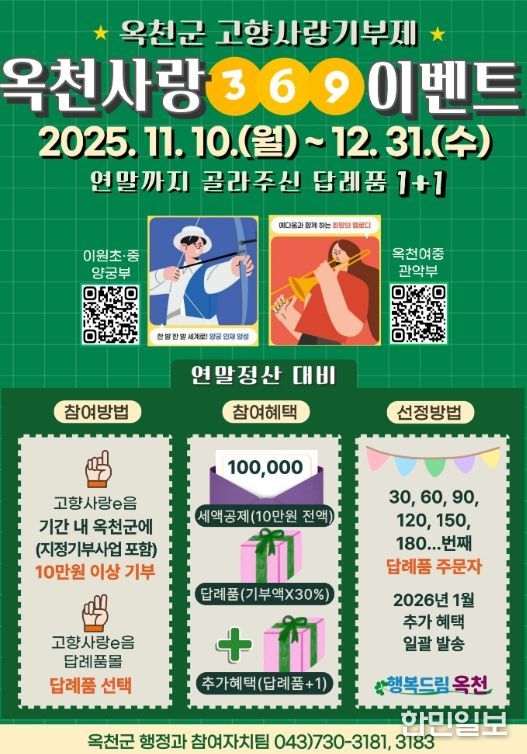 한민일보 서울포커스 김다남 기자 | 옥천군이 연말맞이 고향사랑기부제 활성화를 위해 특별 이벤트를 진행한다.