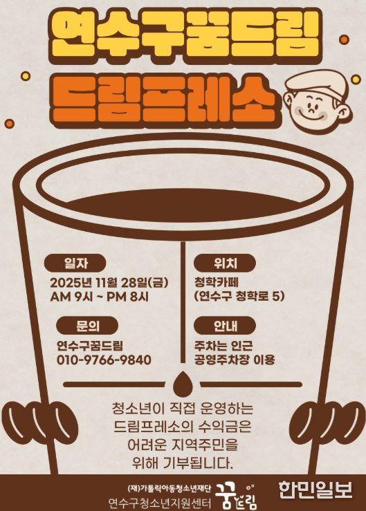 한민일보 서울포커스 백진욱 기자 | 연수구학교밖청소년지원센터 ‘꿈드림’은 오는 28일 청학카페(청학로 5)에서 학교 밖 청소년이 직접 운영하는 일일 카페 ‘드림프레스’를 연다.