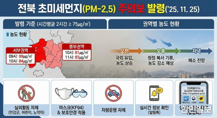 한민일보 서울포커스 진광성 기자 | 전북특별자치도 보건환경연구원은 25일 오전 전북 서부권과 중부권에 국외 오염물질 유입의 영향으로 초미세먼지(PM-2.5) 농도가 높아지며 초미세먼지 주의보를 발령했다고 밝혔다.