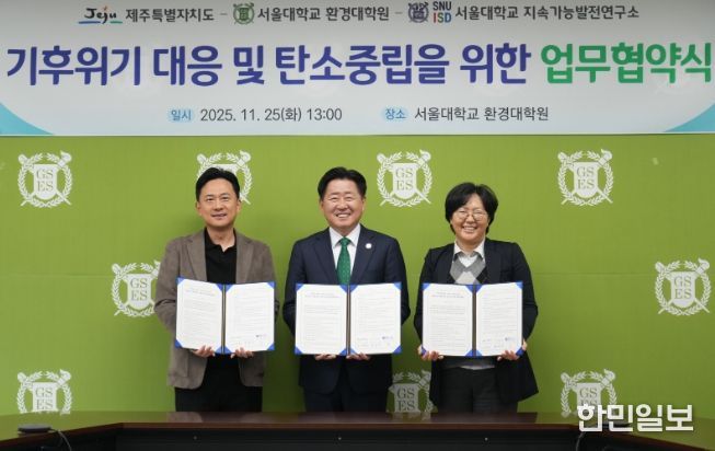 제주도는 25일 오전 서울대학교에서 서울대 환경대학원, 지속가능발전연구소와 ‘기후위기 대응 및 탄소중립을 위한 지속가능 정책 연구·자문 및 교류 업무협약’을 체결했다.