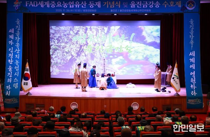 한민일보 서울포커스 김서윤 기자 | 울진군은 세계가 인정한 울진 금강송의 가치를 군민과 함께 공유하고 보전 의지를 다지기 위해 개최한‘울진금강송산지농업시스템’ FAO 세계중요농업유산(GIAHS) 등재 기념식 및 제15회 울진금강송 수호제를 11월 26일 근남면 왕피천공원 문화관에서 성황리에 마무리했다.