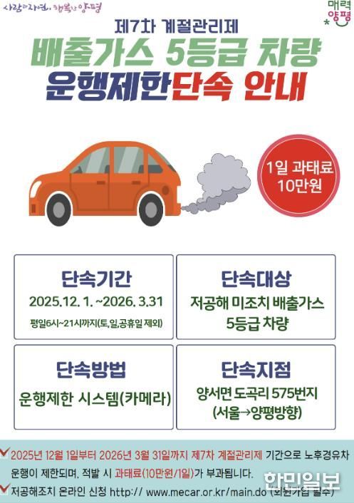한민일보 서울포커스 차재만 기자 | 양평군(은 오는 12월 1일부터 2026년 3월 31일까지 제7차 미세먼지 계절 관리제 시행에 따라 배출가스 5등급 차량에 대한 운행 제한 단속을 시행한다고 밝혔다.