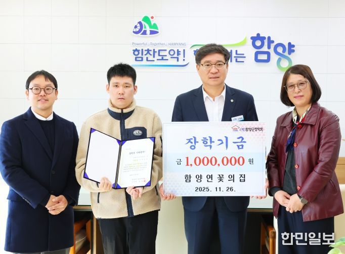 한민일보 서울포커스 김서윤 기자 | (재)함양군장학회는 11월 26일 함양연꽃의 집(원장 김재성)에서 인재 양성을 위해 장학금 100만 원을 기탁했다고 밝혔다.