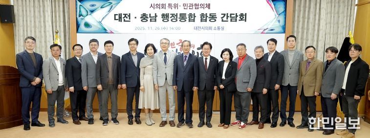 한민일보 서울포커스 김서윤 기자 | 대전충남 행정통합 민관협의체는 26일 대전시의회 소통실에서 대전광역시의회 대전충남 행정통합 특별위원회과 합동 간담회를 열었다.