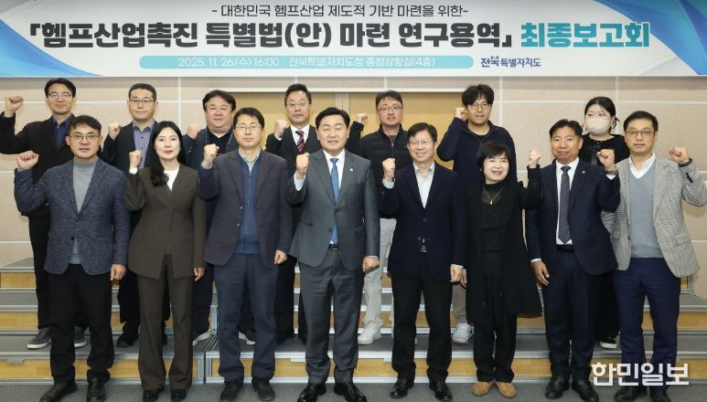 도는 26일 도청 종합상황실에서 '헴프산업촉진 특별법안 보완 및 조문별 조서작성 연구용역' 최종보고회를 개최했다. 이날 보고회에는 도와 새만금개발청, 헴프 관련 기업, 외부 전문가, 용역 수행기관 등 30여 명이 참석해 특별법 제정의 필요성과 추진 전략을 논의했다.