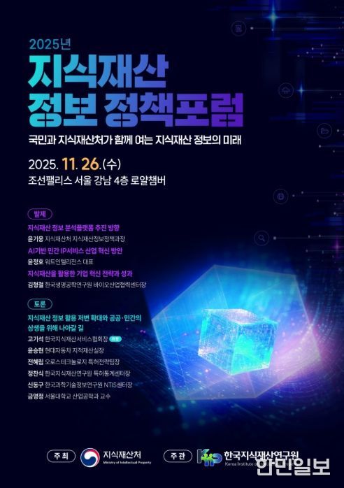 한민일보 서울포커스 기자 | 지식재산처는 11월 26일 13시, 조선팰리스 서울 강남(서울 강남구)에서 ‘2025년 지식재산 정보 정책 공개 토론회’을 개최한다고 밝혔다.