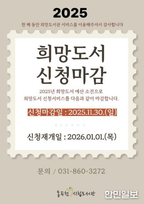 한민일보 서울포커스 임경복 기자 | 동두천시립도서관은 2025년도 희망도서 신청을 오는 11월 30일 마감한다. 마감 이후 접수된 도서는 2026년 1월부터 순차적으로 장서에 반영될 예정이다.