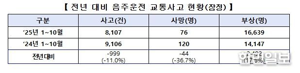 경찰청에서는 지속적인 음주운전 특별단속 및 집중 홍보, 음주 측정방해 행위(일명 술타기) 처벌 등의 영향으로 2025년 10월 31일 기준 음주 사고(-11.0%, 9,106건→8,107건) 및 사망자(-36.7%, 120명→76명)가 큰 폭으로 감소하고 있다.