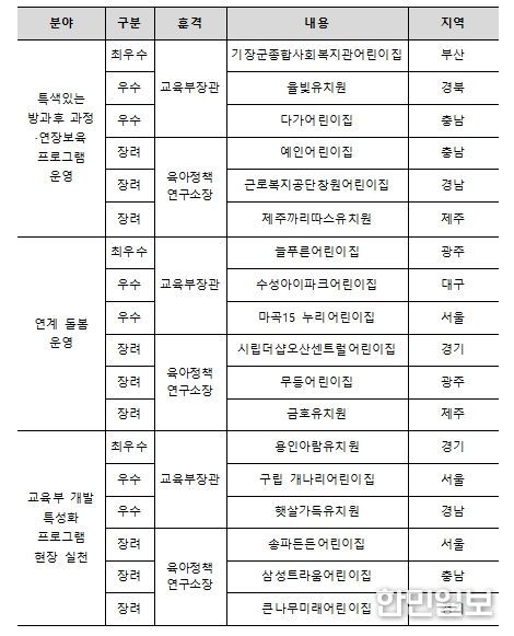 수상작은 각 분야별로 최우수상 1편(교육부장관상), 우수상 2편(교육부장관상), 장려상 3편(육아정책연구소장상)이 선정됐다. 이번 공모전에서는 지역 여건과 기관 특성을 반영하여 기획·운영한 맞춤형 프로그램이 우수사례로 평가받았다.