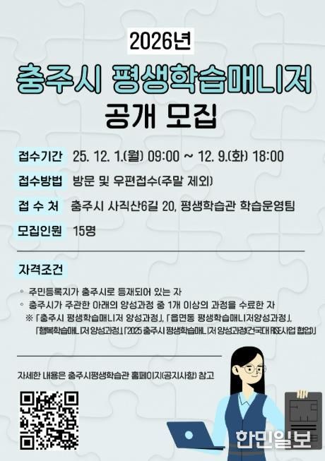 한민일보 서울포커스 김다남 기자 | 충주시가 주민의 근거리 학습권 보장과 지역 특성에 맞는 평생학습 실현을 위해 ‘2026년 충주시 평생학습매니저’를 공개 모집한다고 28일 밝혔다.