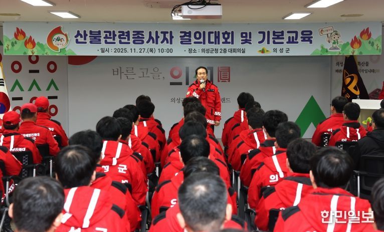 한민일보 서울포커스 김봉순 기자 | 의성군은 11월 27일 10시 군청 2층 대회의실에서 산불전문예방진화대와 공무원산불특별진화대, 읍·면 산업경제팀장 및 담당자 등 120여 명이 참석한 가운데 '2025년 산불방지인력 결의대회 및 기본교육'을 실시했다.