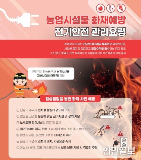 난방기 사용 시에는 연통이 비닐 등 가연성 자재와 접촉하지 않도록 위치를 조정하고 열 차단재를 활용해 화재 위험을 최소화해야 한다. 또한 하우스 내 생활 전기 사용이 늘고 있는 만큼 과도한 멀티탭 사용은 피하고, 작업 종료 후에는 전원 차단과 밸브 잠금을 생활화해야 한다.