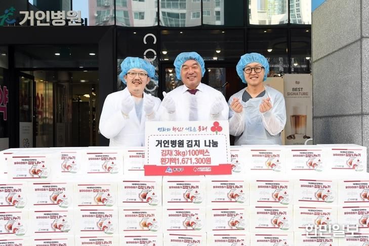 동래구 사직동에 위치한 거인병원은 매년 11월 말 김장김치 나눔 행사를 이어오고 있으며, 임직원들이 직접 배추를 선별부터 절임, 양념, 포장까지 담당하고 있다.