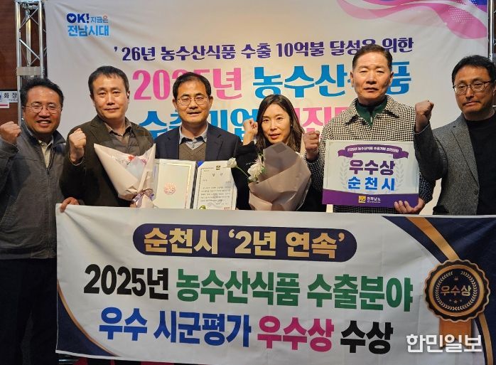 한민일보 서울포커스 임광현 기자 | 순천시는 지난달 28일 남악스카이컨벤션센터에서 열린 2025년 농수산식품 수출분야 우수 시군 평가에서 작년에 이어 우수상을 2년 연속 수상했다.