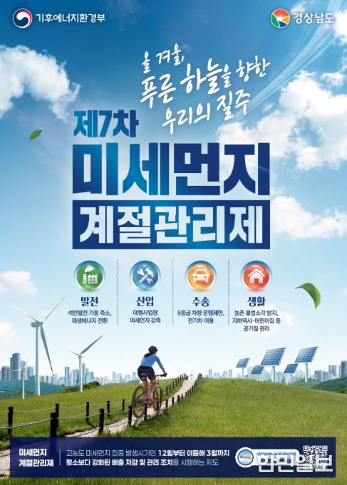 한민일보 서울포커스 진광성 기자 | 경상남도는 올해 12월부터 내년 3월까지 ‘제7차 미세먼지 계절관리제’를 시행하며, 수송·산업·발전·생활 전반에서 미세먼지 배출 저감에 집중 대응 할 계획이라고 밝혔다.