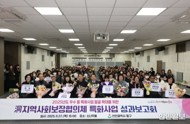 한민일보 서울포커스 백진욱 기자 | 인천 동구는 지난 27일 구청 소나무홀에서‘2025년 洞지역사회보장협의체 특화사업 성과보고회’를 개최하고 우수 사업에 대한 시상을 진행했다고 밝혔다.