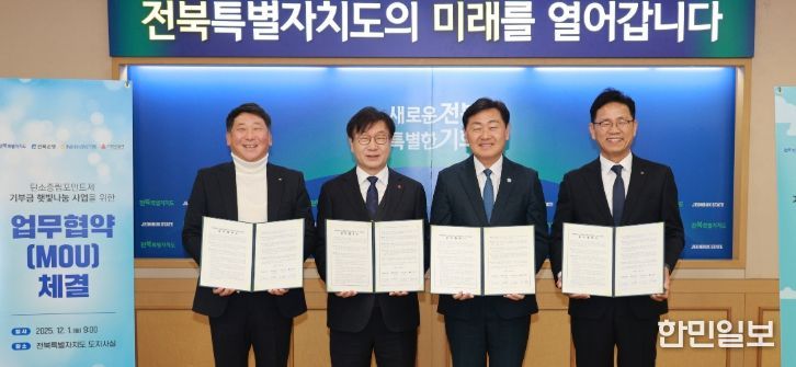 전북도는 1일 도청에서 전북은행, 농협은행, 전북사회복지공동모금회와 ‘탄소중립 햇빛나눔 업무협약’을 체결하고, 기후위기 취약계층을 위한 새로운 에너지 복지 모델을 선보였다. 이날 협약식에는 김관영 도지사, 오현곤 전북은행 부은행장, 김성훈 농협은행 전북본부장, 한명규 전북사회복지공동모금회장이 참석해 사업 취지와 향후 협력 방향을 공유했다.