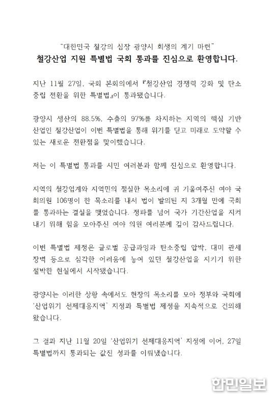 한민일보 서울포커스 임광현 기자 | 광양시는 지난 11월 27일 국회 본회의에서 '철강산업 경쟁력 강화 및 저탄소 전환 촉진을 위한 특별법(이하 ‘K-스틸법’)'이 통과된 데 대해 환영의 뜻을 밝혔다.