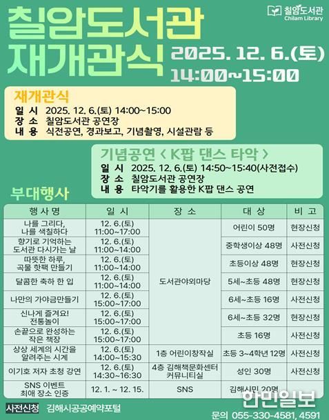 한민일보 서울포커스 김은금 기자 | 김해시 칠암도서관이 오는 6일 도서관 공연장에서 재개관식을 개최한다고 2일 밝혔다.
