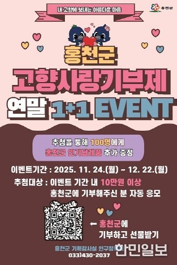 한편, 홍천군은 현재 ‘고향사랑기부제 1+1 이벤트’도 함께 추진하고 있다. 11월 24일부터 12월 22일까지 홍천군에 10만 원 이상 기부하면, 100명을 추첨해 홍천군 인기 답례품을 추가로 증정하는 행사다.