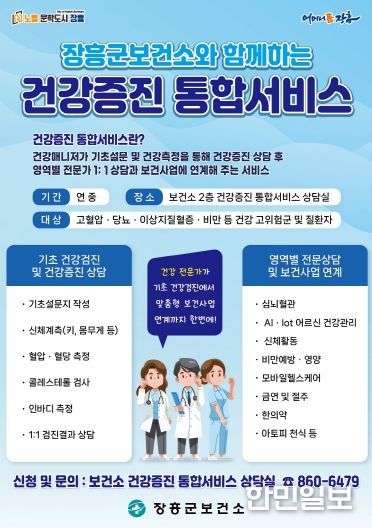 한편, 서비스 참여를 희망하는 장흥군민은 장흥군보건소 건강증진 통합서비스 상담실로 문의(사전 예약)하면 된다.