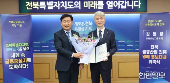 한민일보 서울포커스 임철현 기자 | 전북특별자치도는 2일 도청에서 미래오성그룹 김범창 회장을 금융산업 진흥 명예 홍보대사로 위촉하며 금융산업 진흥 정책의 국내외 홍보를 강화한다고 밝혔다.