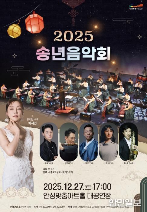 한민일보 서울포커스 임경복 기자 | 안성맞춤아트홀은 오는 27일 토요일 오후 5시, 세종국악심포니오케스트라와 함께하는 '2025 송년음악회'를 개최한다. 이번 공연은 한 해의 마지막을 따뜻하게 채워줄 대규모 송년음악회로, 국악의 전통성과 현대적 감성을 조화롭게 담아낸 프로그램을 통해 관객에게 위로와 희망의 메시지를 전하고자 기획됐다.