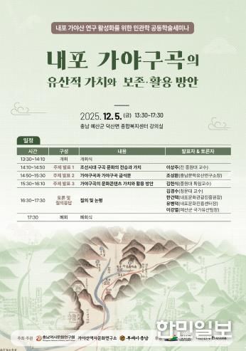한민일보 서울포커스 박덕환 기자 | 충남역사문화연구원과 가야산역사문화연구소가 공동으로 주최하는 내포 가야산 연구 활성화를 위한 민관학 공동학술세미나가 오는 12월 5일에 오후 13시 예산군 덕산면 종합복지센터 강의실에서 개최된다.