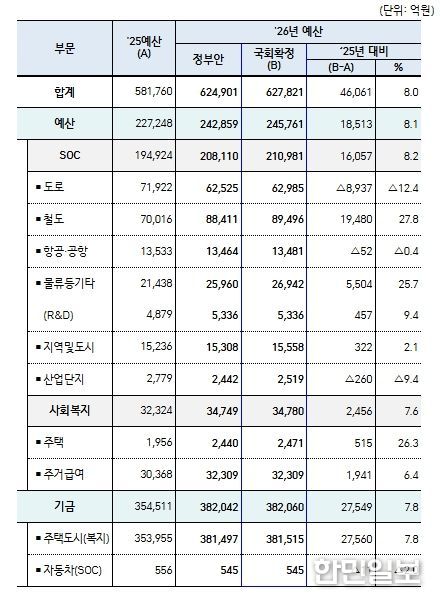 한민일보 서울포커스 임철현 기자 | 국토교통부는 12월 2일 국회 본회의 의결을 거쳐 ‘26년 국토부 예산이 62.8조원으로 최종 확정됐다고 밝혔다.