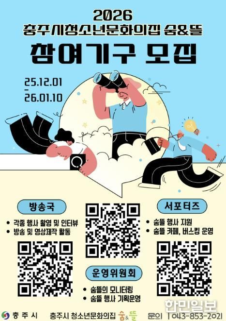 한민일보 서울포커스 김다남 기자 | 충주시청소년문화의집 숨&뜰은 2026년을 함께할 청소년 참여기구 신규부원을 모집한다고 4일 밝혔다.