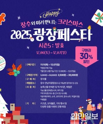 한민일보 서울포커스 김용택 기자 | 장수군은 6일부터 7일까지 이틀간 장수 만남의광장(더레드하우스 앞)에서 올해 마지막 광장페스타인 ‘시즌5: 미리크리스마스’를 개최한다고 밝혔다.