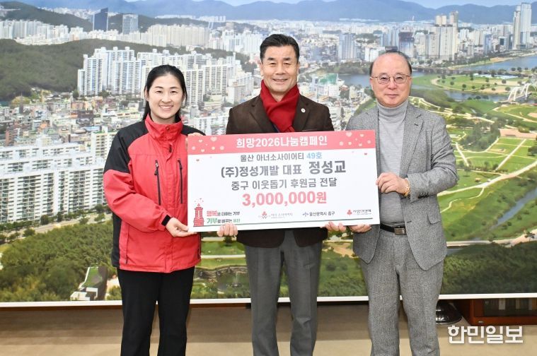 한민일보 서울포커스 기자 | ㈜정성개발(대표이사 정성교)이 12월 5일 오후 3시 30분 중구청 구청장실을 방문해 울산사회복지공동모금회를 통해 이웃돕기 후원금 300만 원을 전달했다.