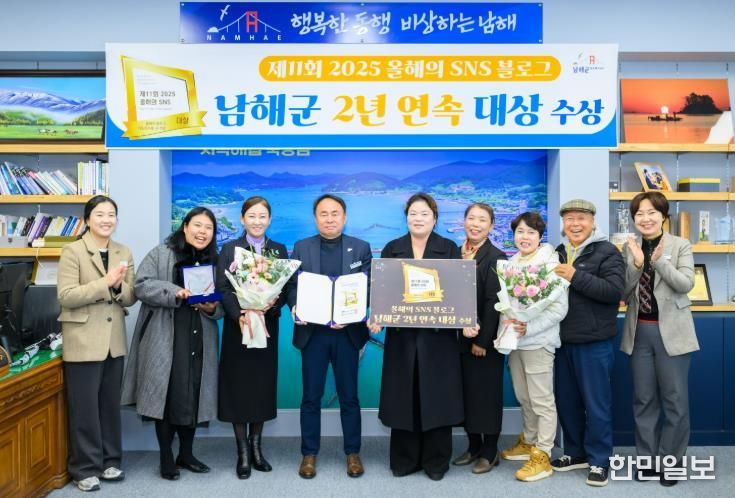 한민일보 서울포커스 김서윤 기자 | 남해군이 (사)한국소셜콘텐츠진흥협회와 과학기술정보통신부가 주최·주관한 ‘제11회 2025 올해의 SNS’ 블로그 부문에서 지난해에 이어 2년 연속 지자체 군 부문 ‘대상’을 수상하는 영예를 안았다.