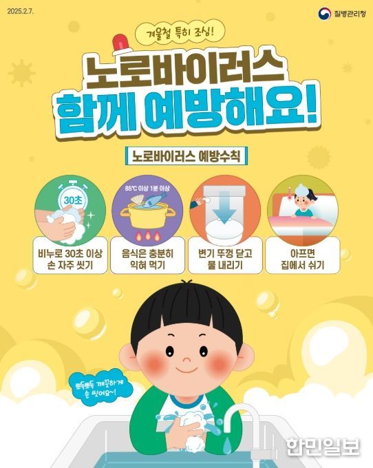 임승관 질병관리청장은 “노로바이러스감염증을 예방하기 위해 올바른 손씻기 등 예방수칙 준수와 안전하게 조리한 음식 섭취를 당부하고, 특히 영유아 보육시설에서는 유증상자 등원 자제와 환자 사용 공간 소독을 강조하며, 집단환자 발생 시 가까운 보건소로 신고할 것을 당부했다.