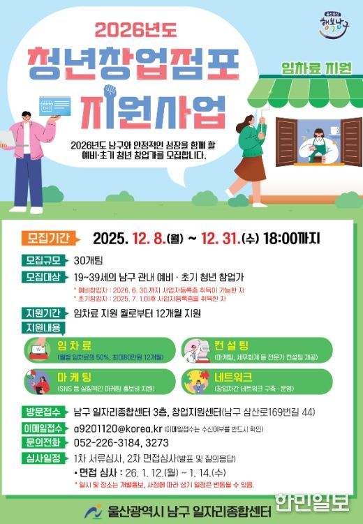 한민일보 서울포커스 기자 | 울산 남구는 청년 창업자들의 지역 내 안정적인 정착과 창업 활성화를 위해 12월 31일까지 ‘2026년 청년창업점포 지원사업’에 참여할 30개 점포를 모집한다고 밝혔다.
