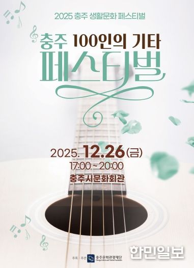 한민일보 서울포커스 김다남 기자 | (재)충주문화관광재단은 오는 12월 26일 충주시문화회관에서‘충주 100인의 기타 페스티벌’을 개최한다고 밝혔다. 이번 페스티벌은 충주 지역의 기타동아리들이 한자리에 모여 기타의 아름다운 선율을 시민들에게 선보이는 자리로, 통기타와 클래식기타를 모두 아우르는 공연 구성이 특징이다.