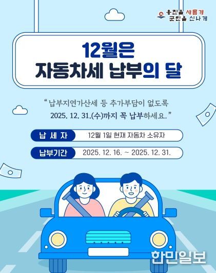 이번 자동차세는 올해 7월부터 12월까지 소유 기간에 대한 세금으로, 12월 1일 기준 자동차등록원부상 소유자에게 부과된다. 과세대상은 자동차관리법의 규정에 따라 등록된 차량 및 건설기계관리법에 따라 등록된 건설기계, 125cc초과 이륜차량이며 납부 기한은 2025년 12월 31일까지다.